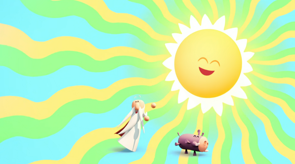 Die 3D-Animation der Serie ist wirklich sehr gut und steht großen Häusern wie Disney, Illumination und Dreamworks nicht nach. Insbesondere die oben bereits erwähnten Szenen mit dem verrückten Miraculix sind besonders einprägsam und zeigen die Kreativität der Animateure. In diesen Szenen ist auch ein Knetmännchen-Miraculix, der mit der Sonne tanzt (Bild 4), Asterix der als Storyboard-Zeichnung (Bild 5) spricht oder eine James-Bond Sequenz (Bild 3) normal. Die Serie hat aber dennoch einen eigenen Animationsstil der sich in die bisherigen 3D-Abenteuer einreiht. Visuelle Gags und Onomatopoesie (Lautmalerei) wie „Paff“ oder „Peng“ wie im Comic sind daher auch vorhanden und bringen eine nostalgische Note (Bild 1).